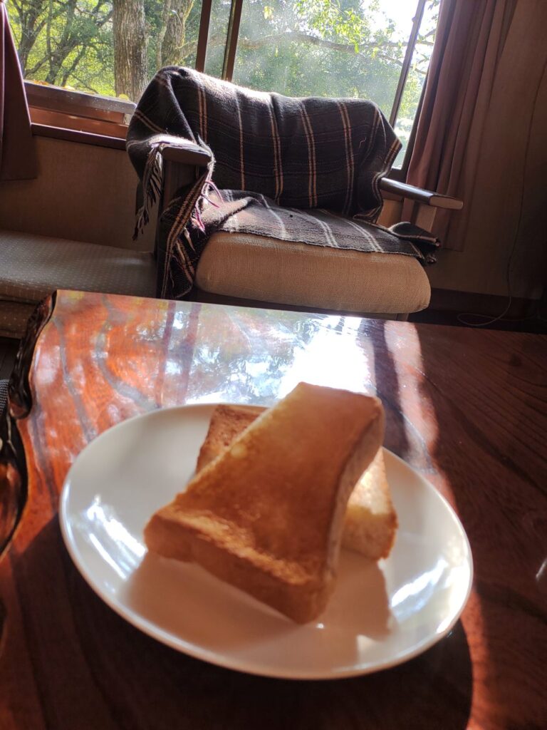 朝ごはんは、500円でトースト(バター&いちごジャム付き)とコーヒーが食べれます。